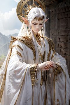 masterpiece,best quality,pili\(muou\), puppet show, 1boy, 1girl, artist name, beads, blurry, blurry background, bracelet, cape, circlet, cloak, closed eyes, closed mouth, cloud, cowboy shot, crown, dress, earrings, elf, expressionless, facial mark, fantasy, fingernails, forehead jewel, forehead mark, gem, hair ornament, halo, jewelry, lips, long hair, long sleeves, looking at viewer, male focus, necklace, outdoors, own hands together, pale skin, pointy ears, praying, realistic, ring, robe, signature, sky, solo, standing, upper body, watermark, white hair, wide sleeves,<lora:pilimuouxi-000006:0.6>,