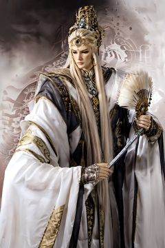 masterpiece,best quality,pili\(muou\), puppet show, 1boy, 1girl, armor, beard, blonde hair, brooch, brown background, brown eyes, chinese clothes, circlet, closed eyes, closed mouth, crown, expressionless, facial hair, fantasy, feathers, gem, hair ornament, hand fan, hat, headdress, holding, jewelry, lips, long hair, long sleeves, looking at viewer, male focus, manly, necklace, old, realistic, robe, serious, sidelocks, skull, sleeves past wrists, solo, staff, sword, tassel, tiara, upper body, weapon, white hair, wide sleeves,<lora:pilimuouxi-000016:0.65>,