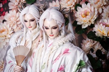 masterpiece,best quality,pili\(muou\),puppet show,1boy,1girl,bangs,black eyes,blue eyes,blurry,blurry background,bouquet,cherry blossoms,chinese clothes,closed mouth,depth of field,earrings,eyeshadow,facial mark,flower,folding fan,forehead mark,fur,fur collar,fur trim,gloves,hair ornament,hand fan,holding,holding fan,horns,jewelry,kimono,lips,lipstick,long hair,lotus,makeup,male focus,nose,pale skin,personification,pink flower,ponytail,realistic,red lips,ring,smile,solo,upper body,white hair,<lora:pilimuouxi-000006:0.65>,