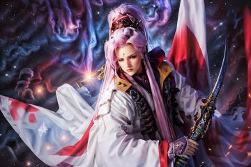 masterpiece,best quality,pili\(muou\),puppet show,1boy,1girl,armor,bangs,cape,closed eyes,closed mouth,cowboy shot,dutch angle,facial mark,forehead mark,gloves,glowing,hair between eyes,hair ornament,holding,holding sword,holding weapon,jewelry,katana,long hair,long sleeves,looking at viewer,male focus,night,pink hair,ponytail,purple hair,red eyes,sash,serious,sky,solo,space,standing,star \(sky\),star \(symbol\),starry sky,sword,tassel,weapon,white hair,wide sleeves,yellow eyes,<lora:pilimuouxi-000006:0.65>,