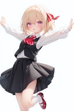 1girl, rumia, blonde hair, solo, white background, red eyes, red footwear, simple background, ascot, short hair, ribbon, open mouth, hair ribbon, smile, long sleeves, shirt, looking at viewer, red ascot, white socks, white shirt, red ribbon, shoes, socks, frills, bangs, outstretched arms, hair between eyes, skirt, :d, dress, vest, mary janes, black dress, black skirt, collared shirt, black vest, blush