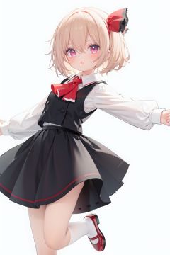 1girl, rumia, blonde hair, solo, white background, red eyes, red footwear, simple background, ascot, short hair, ribbon, open mouth, hair ribbon, smile, long sleeves, shirt, looking at viewer, red ascot, white socks, white shirt, red ribbon, shoes, socks, frills, bangs, outstretched arms, hair between eyes, skirt, :d, dress, vest, mary janes, black dress, black skirt, collared shirt, black vest, blush