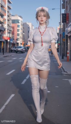 masterpiece,best quality,(cityscape:1.4),(street:1.4),(front view:1.3),(full body:1.2),(outdoors:1.3),(photorealistic:1.4),unity 8k wallpaper,(large breasts:1.3),see-through,(thighhighs:1.2),(ultra detailed:1.3),standing,1girl,solo,glasses,nurse,nurse cap,lips,hair ornament,<lora:hushiv1:0.7>,