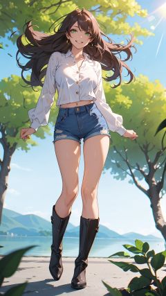 masterpiece,best quality,highres,incredibly absurdres,absurdres,very_high resolution,(chromatic aberration:1.2),(film grain:1.2),cinematic,(bokeh:1.2),(caustics:1.2),light_particles,lens flare,blurry background,(blurry_foreground:1.1),depth of field,scenery,landscape,octane render,volumetric light,blurry,picturesque_scenery,1girl,solo,solo_focus,tsurime,eyeliner,eyelashes,eyeshadow,lips,(lipgloss),shiny skin,toned,narrow waist,mature_female,tall female,milf,curvy,large_breasts,perky_breasts, long legs, wavy hair,forehead,parted bangs,lateral view,long hair,hair behind ear,brown hair,(floating hair:1.2),green_eyes,smile,light smile,grin,wind,denim shorts,buttons,long sleeves,white blouse,earrings,knee boots,black footwear,(low-angle_shot),flower,sunlight,park,plant,nature,outdoors,lake,pavement,mountainous horizon,clear sky,motion blur,house,under_tree,
