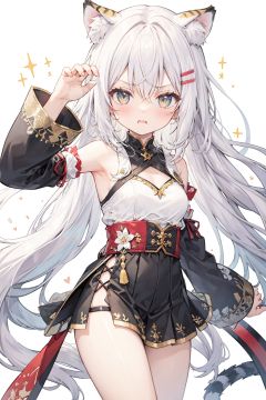 angry,frown,grievance++++loli,petite,medium breast,(panorama:1.2),causticstail,disheveled hair, messy hair, long bangs, floating hair,highleg,solo+++loose clothes,(black t-detached sleeves:1.4)++,hairclip,++++Yellow eyes,white hair,tiger ears,fang out,{beautiful eyes},solo,