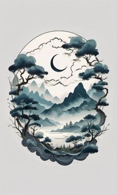 A circle with a forest inside, a crescent moon, clouds below the circle, and lightning around it.,chinese meticulous ink,illustration,white background ,centered,completed<lora:newchinese-1122-1:1>