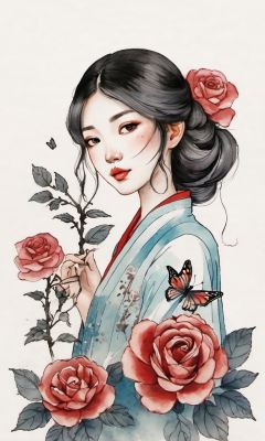 a girl with a butterfly on her face and a rose besize her head.,chinese meticulous ink,illustration,white background ,centered,completed<lora:newchinese-1122-1:1>