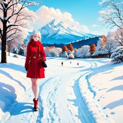 In the snow, a girl walking alone in the snow, wearing a red coat, long hair fluttering, white hair, red scarf, bare legs, bare feet, holding her body tightly, big eyes, her lips pressed together, she was about to cry, her long white hair fluttering in the wind, her delicate and beautiful face suppressed, step by step, the footprints behind her, the heavy snow, the biting wind blowing her scarf, in the distance is the continuous snow mountain, in this evening, helplessly forward, West Green, fashion,1girl