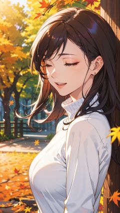 masterpiece,best quality,highres,incredibly absurdres,absurdres,very_high resolution,chromatic aberration,film grain,cinematic,bokeh,caustics,light_particles,lens flare,blurry background,blurry_foreground,depth of field,detailed beautiful scene,scenery,landscape,UHD wallpaper,HDR,8k unity render,octane render,artstation,concept art,global illumination,studio light,volumetric light,dramatic light,blurry,picturesque_scenery,beautiful_optical_effects,1girl,solo,solo_focus,shiny hair,glossy hair,sharp_eyelid,eyeliner,eyelashes,eyeshadow,perfect detailed face,lips,(lipgloss),glossy skin,shiny skin,skinny,toned,mature_female,milf,wide hips,curvy,large_breasts,perky_breasts,forehead,parted bangs,wavy hair,long hair,disheveled_hair,brown hair,hair behind ear,close-up,portrait,closed_eyes,pov,parted_lips,:d,smile,lateral view,teeth,bust,face_focus,looking away,turtleneck sweater,white sweater,open_mouth,outdoors,wildness,maple leaf,path,nature,forest,autumn,autumn leaves,photorealistic,dappled sunlight,
