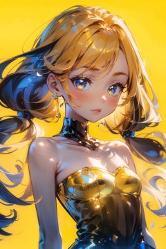 Best quality, 8k,cg,(masterpiece, high quality, highres,Highest picture quality), (Master's work),yellow background,dynamic Angle,Solid color background,Flat color,cute little girl,loli,solo,solo focus,detailed eyes,detailed face,shiny hair, shiny skin, shiny eyes, yellow hair,low twintails,collarbone, bare shoulders,yellow clothes,