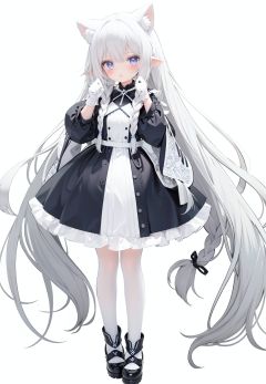 1girl, white_gloves, braid, full_body, gloves, long_hair, official_alternate_costume, pointy_ears, simple_background, solo, standing, very_long_hair, white_background, white hair, blue eyes, paw claw pose, open_mouth