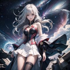 ((masterpiece)), (((best quality))), ((ultra-detailed)), ((illustration)), ((disheveled hair)), beautiful detailed eyes, (1girl:1.2),(solo), dynamic angle, dark magician girl,(black kneehighs:1.1),(starry tornado:1.4), starry Nebula, ((frills)), beautiful detailed sky, beautiful detailed eyes,evil smile, expressionless,hairs between eyes,  white  hair,pleated skirt,((disreveled hair))