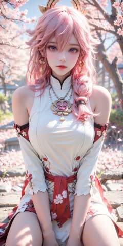 <lora:bachong_20231120220302:0.75>,(ulzzang-6500-v1.1:0.6),(raw photo:1.2),((photorealistic:1.4))best quality,masterpiece,illustration,an extremely delicate and beautiful,extremely detailed,CG,unity,8k wallpaper,Amazing,finely detail,masterpiece,best quality,official art,extremely detailed CG unity 8k wallpaper,absurdres,incredibly absurdres,huge filesize,ultra-detailed,highres,extremely detailed,beautiful detailed girl,cinematic lighting,1girl,see-through,looking at viewer,outdoors,(jewelry),necklace,hair_ornament,hair_flower,chain,black eyes,(pale skin:1.2),tall female,(perfect body shape),skinny body,Long Legs,Slender legs,skinny body,plum blossom,Plum Tree,(Outdoor:1.3),petals on the ground,(pink hair:1.3),gradient hair,high_heels,bachong,1girl,yae miko,solo,pink hair,purple eyes,looking at viewer,long hair,detached sleeves,bare shoulders,hair between eyes,blurry background,bangs,hair ornament,blurry,jewelry,animal ears,fox ears,earrings,white shirt,shirt,purple eyes,(sitting:1.3),(sitting on a stone:1.3),(from below:1.3),