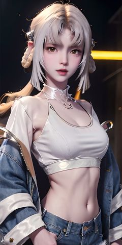 super fine illustration, vibrant colors, masterpiece, sharp focus, best quality, depth of field, cinematic lighting, ultra detailed, 1girl, solo, denim jacket, white shirt, crop top, midriff, denim shorts, large breasts, long hair, silver hair, red eyes, blush, street, 龙雅婷,<lora:EMS-91047-EMS:0.800000>