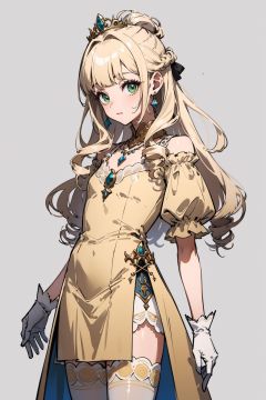 1female,solo,white gloves,jewelry,yellow dress,blonde hair,earrings,long hair,yellow dress,simple background,grey background,necklace,bangs,tiara,looking at viewer,curly hair,blunt bangs,green eyes,white gloves,Cadis Etrama Di Raizel,(White lace gloves:1.55), (Noblesse:1.66),OuterWorldAI, fantasy,(lace edge:1.55),Medieval aristocrat,The gorgeous queen,(long curly hair:1.55),(cowboy shot:1.35),(Spiral curl:1.65),spirals,Tie one's hair,(spiralcurl:1.55),(long curly hair:1.55),(long curly hair:1.55),(white silk stockings:1.55),fantasy,top Knot,(Flat coating:1.65),Elegant female,(Mature woman:1.35),(A medieval queen's dress:1.55),(cuff:1.53)