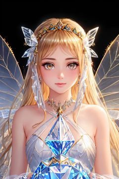 Realistic, photo, half length, best quality, stunning, beautiful golden eyes, fine details, depth of field, extremely detailed CG unified 8k wallpaper, (1 girl: 1.5), crystal background, ice magic, masterpiece, splashing details, beautiful details crystal, crystal eyes, stunning, (realistic: 1.5), (transparent ice crystal color wings: 1.4), original, (masterpiece)