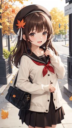 1girl, skirt, sailor collar, holding, smile, pleated skirt, hat, school uniform, solo, camera, long hair, off shoulder, shirt, bag, brown eyes, blurry, :d, bangs, serafuku, black sailor collar, holding camera, black skirt, autumn leaves, white headwear, white shirt, leaf, long sleeves, open clothes, open mouth, puffy long sleeves, blush, looking at viewer, ginkgo leaf, animal, blurry foreground, depth of field, cardigan, animal on shoulder, squirrel, blurry background, bow, beret, brown hair, black bow, puffy sleeves, open cardigan, hair between eyes, autumn, shoulder bag, hair ribbon, ribbon, white cardigan, maple leaf, outdoors, collarbone, falling leaves