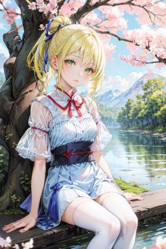 1girl, yellow hair, a dull hair, green eyes, red cheeks. Her hair is tied up with blue ribbons, she is wearing white clothes, white stockings, and the background of the picture is cherry blossom.she is sitting under the tree beside the river.,backlight,hanging