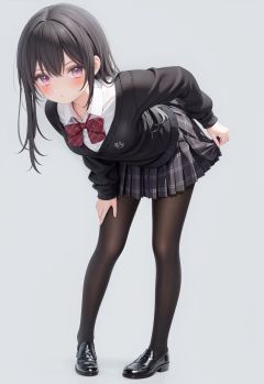 1girl, solo, pantyhose, skirt, long hair, loafers, shoes, simple background, school uniform, brown eyes, plaid, black pantyhose, plaid skirt, looking at viewer, black hair, pantyhose pull, full body, clothes pull, black footwear, pleated skirt, leaning forward, bangs, long sleeves, bent over, cardigan, bow, bowtie, standing, closed mouth, pulled by self, grey background, blush, miniskirt, red bow, sweater, **********