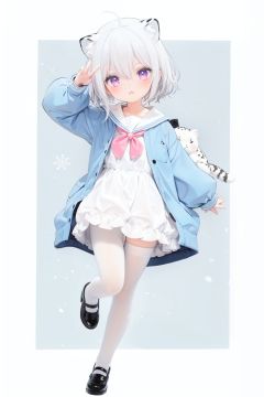cute,Infant,solo blue shirt,blue sailor coat,loli,full body,white hair,snow leopard ear,white background,pink eyes,laugh,happy,white pantihose,white pantyhose,red armband,