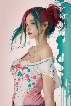 (Multicolored hair:1.3), Pink hair, Light blue hair, Colored inner hair, blue hair, green hair, light green hair, aqua hair, white hair, Orange hair, red hair, Short hair, Big hair, Ahoge, Parted lips, (baggy clothes:1.2), solo, (upper body), wind, standing, grey background, simple background, (drawn by Pomu:1.4), NanaseKurumi, solo, (upper body), Standing, off-shoulder, (splatter background:1.5), simple background, outline, watercolor (medium), concept art, seductive green eyes, Big breasts, nikon d850, smooth, dynamic lighting, ((Big tits)), long hair, Chest out, Cleavage, Ponytail, 16 years old, Long ponytail, Clean face, from side, cowboy shot, masterpiece, best quality,1 girl