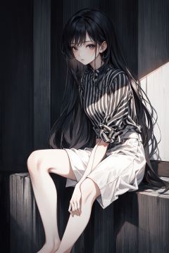 A HongKong style about 23 years old young girl, full body ,She is dressed in a Black striped shirt, white background , emphasizing the play of light and shadow, highlighting intricate details,It is available in both 4K and high-definition resolutions,Wuqiii,Wumag