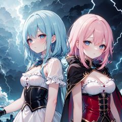 ((best quality)), ((masterpiece)), ((ultra-detailed)), (illustration), (detailed light), (an extremely delicate and beautiful), (2 girls:1.3), (cowboy shot),[(confrontation split screen theme)::0.35],/=(left-side<(girl a<((spread lots of red_Lightning on cape),(spread lots of red Lightning on frills bustier))> and red hair and(Lightning strike and (Electric shock:1.25)))>),(Detailed anime face),glowing pupil,/=(Back to back:1.2),(yuri:0.8),(Lightning-pov:1.3),/=(right-side<(girl b<((spread lots of blue_Lightning on cape),(spread lots of blue Lightning on frills bustier))> and blue hair and (Lightning strike and (Electric shock:1.25)))>),(Detailed anime face),glowing pupil,/=(night sky background),(cloudy sky),((electricity)),((wind)),Depth of Field,best-lighting,volumetric-light,