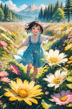 absurdres,incredibly absurdres,masterpiece,best quality,1girl,1boy,child,detail light,small animals,in spring,nature,action,kawaii,in a meadow,full-blown flowers,whole family,love,friend,play,lively,watercolor,happy,smiling,HS,