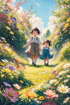 absurdres,incredibly absurdres,masterpiece,best quality,1girl,1boy,child,detail light,small animals,in spring,nature,action,kawaii,in a meadow,full-blown flowers,whole family,love,friend,play,lively,watercolor,happy,smiling,HS,