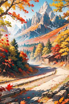 masterpiece,best quality, ultra-detailed, chfsh,extreme detail description,professional,landscape, Beautiful scenery of autumn maple leaf,red leaves,falling leaves, mountain road,