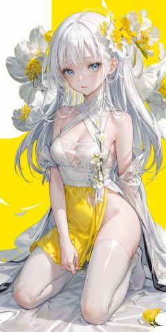 1girl, blue eyes, white long translucent night gown, expressionless, (white hair), hair cover one eye, long hair, yellow hair flower, kneeling on lake, blood, (plenty of yellow petals:1.35), (white background:1.5), (English text), greyscale, monochrome, greyscale, monochrome, sketch,backlight,pantyhose