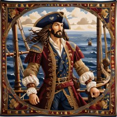 master tapissier, Woolcraft, sci-fi Renaissance fantasy world, A tapestry unfolds the portrait of Sir Reynard, a swashbuckling pirate with windswept hair, standing on the deck of a ship, his eyes fixed on the horizon. Crafted with precision, this tapestry comes to life as skilled hands weave vibrant threads of wool into a breathtaking person. Each stitch contributes to the play of light and shadow, capturing the essence of thier natural beauty. The weaver's expertise transforms raw wool into a masterpiece, inviting viewers to immerse themselves in the intricacies of the woven people