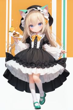 (cinematic lighting), dreamy atmosphere, Ray tracing, (((solo))), (loli:1.5), (child:1.5), (petite:1.5), green eyes, (animal ears), dress, solo, food, blonde hair, open mouth, long hair, pancake, flower, holding, bow, smile, fork, bird, socks, looking at viewer, shoes, striped background, holding fork, bonnet, striped, frills, long sleeves, :d, yellow dress, bangs, eyebrows visible through hair, blush, green nails, hair bow, nail polish, diagonal stripes, chick, sparkle, frilled dress, orange bow, fruit, full body, :3, hair between eyes, green bow, puffy sleeves, heart, lemon, orange footwear, animal ear fluff, white bow, cat ears, bobby socks, orange headwear, see-through sleeves, blue background, striped bow, hair ornament, white legwear, mary janes
