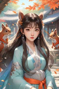 Anime style, (masterpiece: 1.3), best quality, animation works, 1girl, solo, long hair, bangs, hanfu, black hair, wide sleeved flowing fairy skirt, (squirrel), photos, 8k, complex, highly detailed, majestic, digital photography, broken glass, (fine and delicate beautiful eyes: 1.2), hdr, lifelike, high-definition, animation style, key vision, vibrant, studio animation, highly detailed,<lora:蔚蓝动物:0.7>