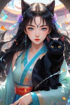 Anime style, (masterpiece: 1.3), best quality, animation works, 1girl, solo, long hair, bangs, hanfu, black hair, wide sleeve flowing fairy skirt, medium hair, (black cat), photos, 8k, complex, highly detailed, majestic, digital photography, broken glass, (fine and beautiful eyes: 1.2), hdr, lifelike, high-definition, animation style, key vision, vibrant, studio animation, highly detailed<lora:蔚蓝动物:0.7>