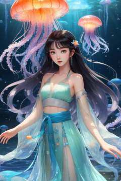 Anime style, (masterpiece: 1.3), best quality, animation works, 1girl, solo, long hair, bangs, hanfu, black hair, wide sleeve flowing fairy skirt, (luminous jellyfish), photos, 8k, complex, highly detailed, majestic, digital photography, broken glass, (fine and delicate beautiful eyes: 1.2), hdr, lifelike, high-definition, animation style, key vision, vibrant, studio animation, highly detailed,<lora:蔚蓝动物:0.7>
