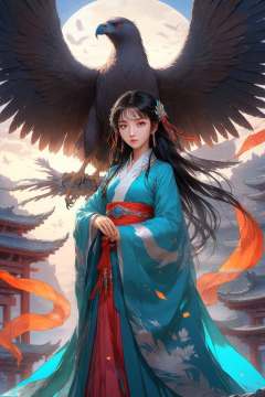 Anime style, (masterpiece: 1.3), best quality, animation works, 1girl, solo, long hair, bangs, hanfu, black hair, wide sleeve flowing fairy skirt, (vulture), photos, 8k, complex, highly detailed, majestic, digital photography, broken glass, (fine and delicate beautiful eyes: 1.2), hdr, lifelike, high-definition, animation style, key vision, vibrant, studio animation, highly detailed,,<lora:蔚蓝动物:0.7>