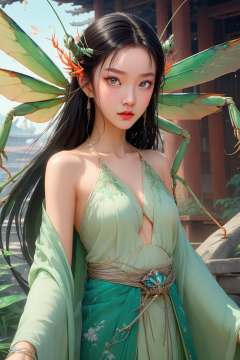 Anime style, (masterpiece: 1.3), best quality, animation works, 1girl, solo, long hair, bangs, hanfu, black hair, wide sleeve flowing fairy skirt, (giant mantis), photos, 8k, complex, highly detailed, majestic, digital photography, broken glass, (fine and delicate beautiful eyes: 1.2), hdr, lifelike, high-definition, animation style, key vision, vibrant, studio animation, highly detailed,,<lora:蔚蓝动物:0.7>