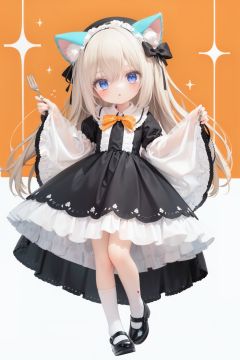 (cinematic lighting), dreamy atmosphere, Ray tracing, (((solo))), (loli:1.5), (child:1.5), (petite:1.5), green eyes, (animal ears), dress, solo, food, blonde hair, open mouth, long hair, pancake, flower, holding, bow, smile, fork, bird, socks, looking at viewer, shoes, striped background, holding fork, bonnet, striped, frills, long sleeves, :d, yellow dress, bangs, eyebrows visible through hair, blush, green nails, hair bow, nail polish, diagonal stripes, chick, sparkle, frilled dress, orange bow, fruit, full body, :3, hair between eyes, green bow, puffy sleeves, heart, lemon, orange footwear, animal ear fluff, white bow, cat ears, bobby socks, orange headwear, see-through sleeves, blue background, striped bow, hair ornament, white legwear, mary janes