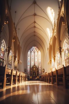 The interior of a golden church features colorful old-fashioned glasses, huge lighting, colorful lighting on the ground, cg scene design, 3D grand scene, epic feeling, strong contrast between light and dark, fantasy, 3D rendering, master level work, high-quality, ultra-high details, 8K high-definition