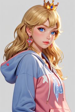 pixar,1girl,blonde hair,princess peach,blue eyes,jewelry,earrings,crown,hoodie,looking at viewer,solo,hood,long hair,lips,eyelashes,casual,simple background.,