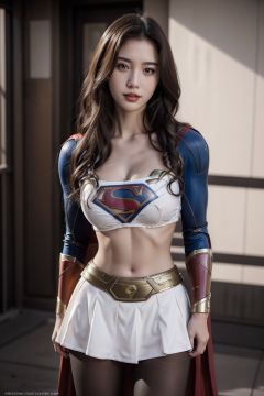 16yo girl, solo, (supergirl, Mecha, white curly hair:1.3), looking at viewer, one arm up,