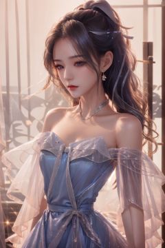 jingliu, 1girl, white hair, long hair, ponytail, hair ribbon, blindfold, earrings, jewelry, blue dress, bare shoulders, detached sleeves, 1 girl, cinematic lighting, ray tracing, reflection light, Sony FE GM, masterpiece, best quality, UHD, high details, award winning, retina