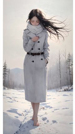 step by step, behind is a series of footprints, the snow is very big, the biting wind blowing her scarf, the distance is unbroken snow mountains, in this evening, helpless forward.