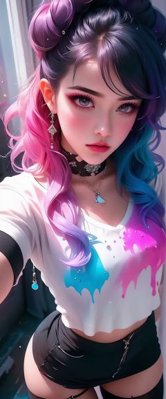 1girl, isometric, shukezouma, octane render, hdr, (hyperdetailed:1.15), (soft light, sharp:1.2), aesthetic, (thighs, stockings),(Argentinian |Cuban |Colombian |Mexican) 20 years old woman, (detailed facial features), gorgeous face, grunge style, standing in her messy bedroom, pale skin, wearing eyeliner, grainy, pastel goth, scene hair, (emo girl), teased hair, wearing bracelets, wearing choker necklace, ((detailed face)), selfie, rainbow painting drops, paint teardrops, girl made up from paint, entirely paint, splat, splash, paint bulb, paint drops, broad light, backlighting, bloom, light sparkles, chromatic aberration, (bubblegum Vaporwave aesthetic),Rashmikasdxl