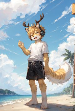 ahoge, furry, Children with bells and headphones, furry, open mouth, Big fluffy tail, An eight-year-old boy, Not a spot on the whole body, Yellow cat ears and brown antlers, Gray shorts, White shirt, The size of the cat, Juvenile, Skinny body type, 1boy, cat boy, furry, cub, ultra cute face, full body, perfect lighting, masterpiece, ultra detailed, White clothes,  ultra detailed fur, Beach, outside, The blue sky and white clouds, Alone,barefoot