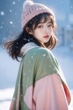 The girl in the plush hat, like a masterpiece of realism, is superior in quality, and the picture quality reaches the ultra-high resolution 16K realm. Imagine, it's snowing outside, she's dressed in pink, her long legs are bare, a apple green coat is draped around her body, and then a coat is covered, the smell of winter is blowing in her face. The picture is high-definition, the contrast between light and dark is prominent, the side light and diffuse reflection are interwoven, the collision light, the close-up moment is frozen, and the strong emotion is coming out. This is the charm of modernism, a picture, a thousand words, gripping.,crystal_dress , crystal , wings ,