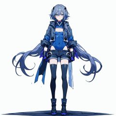 (masterpiece:1.3), (the best quality:1.2), (super fine illustrations:1.2), (Masterpiece), high quality, high detail,(white background:1.2), looking at viewer, (SOLO:1.4),outline,,simple background,,hairband,hoodie,cleavage,leotard under clothes,blue legwear,open clothes,belt,boots,black shorts,hood jacket,black legwear,black footwear,leotard,hair ornament,elbow gloves,black leotard,logo,jacket,bangs,black gloves,hair between eyes,fu hua,blue eyes,gloves,long hair,thighhighs,boots,