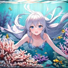 <lora:elaina:0.8>,((masterpiece), best quality, perfect anatomy,wallpaper,1girl,solo,((underwater)),(beautiful detailed water),((coral)),dynamic angle, floating,(detailed light),floating hair,(splash),((fishes)),leaves dress, feather, nature,(sunlight),(underwater forest),(bloom),(detailed glow),drenched, seaweed, fish,(((Tyndall effect))),white hair,
