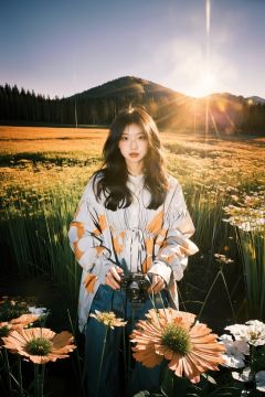 A young girl, with a mischievous grin on her face, is captured as she plays in a field of wildflowers. The flowers are in full bloom, creating a riot of color. The image is shot using a fish-eye lens, giving the scene a distorted, dreamlike quality. The image is inspired by the works of David Hockney, with its playful, vibrant energy.,WuLight